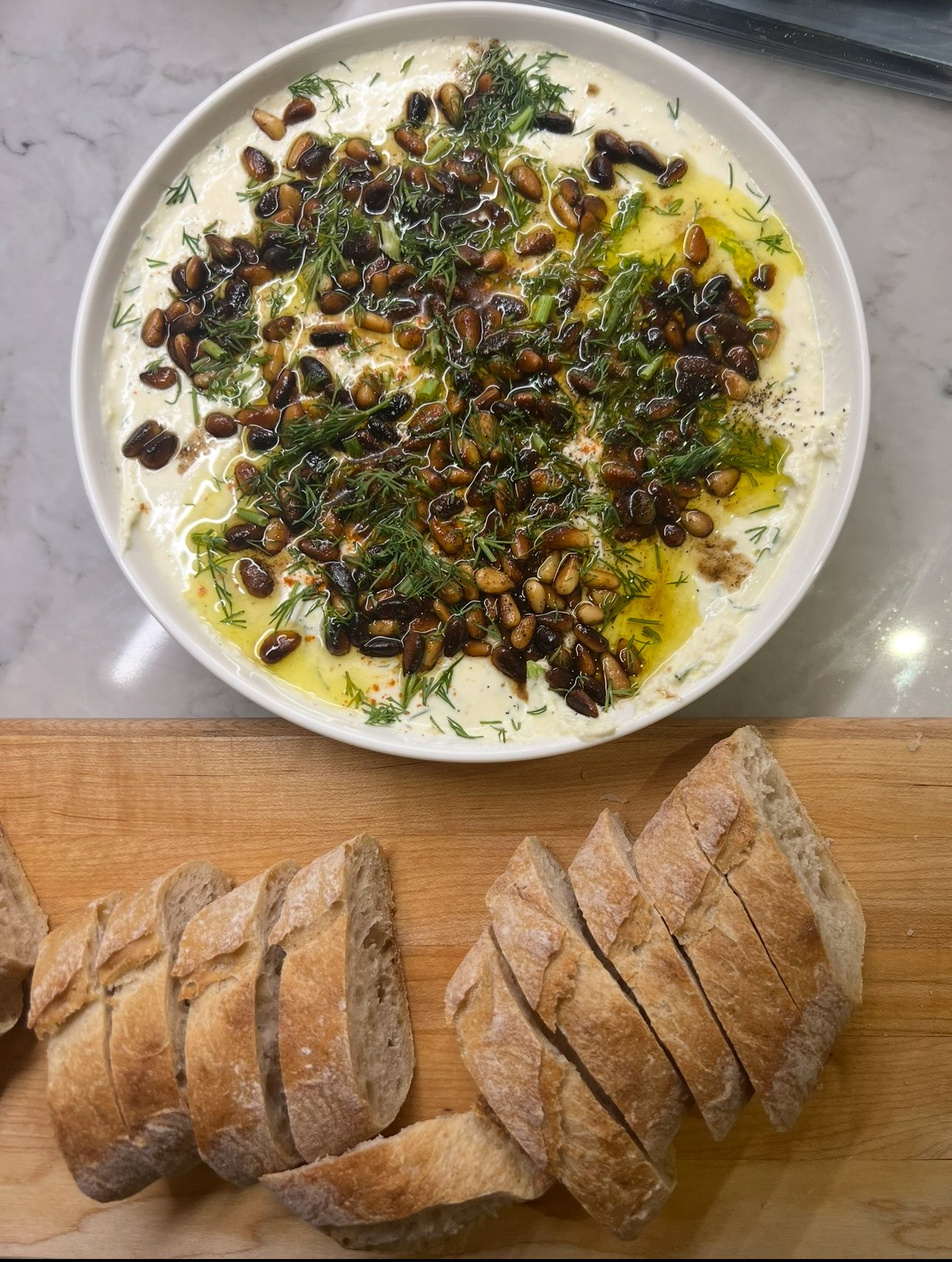 A velvety blend of whipped feta topped with marinated olives, fresh dill, and a drizzle of olive oil.